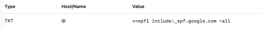 Note: you can only have ONE SPF record. If you use another service for marketing emails, i.e. MailerLite, Beehiiv or Mailchimp, you’ll need to add another domain to the include: parameter. Google provides some examples here.