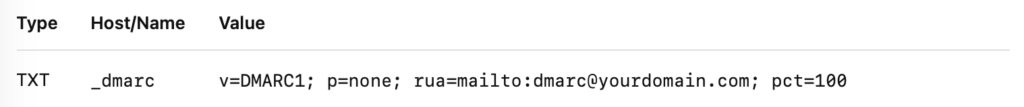 Even a basic DMARC setup is better than none. It’s also a TXT record, and looks like this: