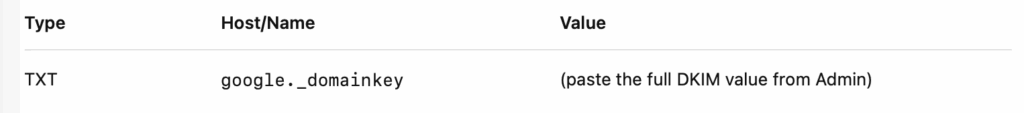 Setting up DKIM is slightly more complicated. It also involves adding a TXT record to your DNS, but you need to login to your Google Admin Console to generate a value to copy: